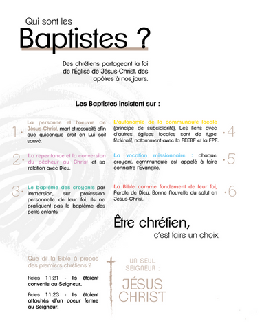 Membres de la Fédération des Eglises Evangéliques Baptistes de France (FEEBF), elle-même rattachée à la Fédération Protestante de France (FPF) et le Conseil National des Evangéliques de France (CNEF) , nous sommes une église c'est-à-dire une assemblée de chrétiens partageant la foi en Jésus Christ.